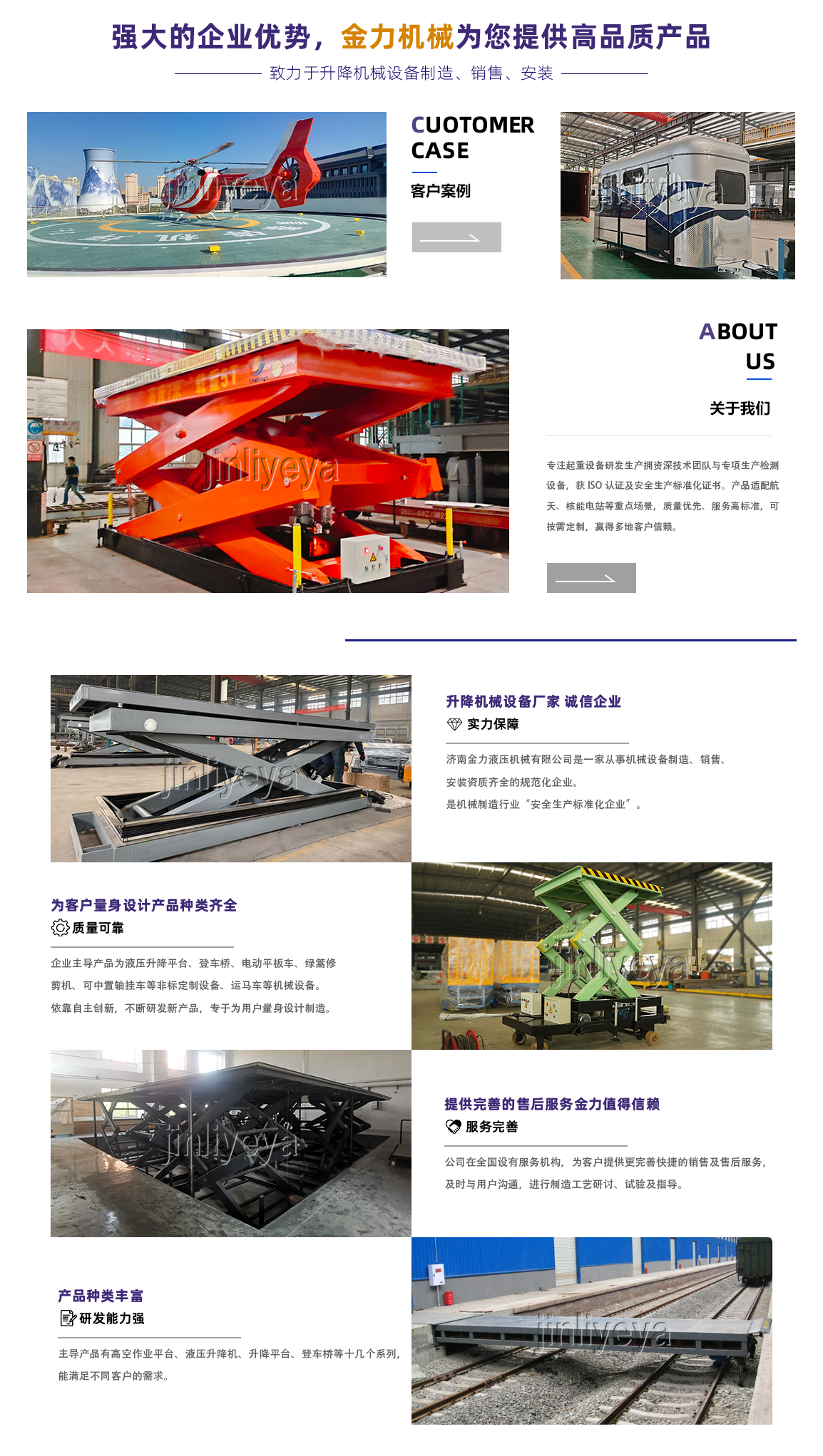 济南金力液压机械有限公司是质量、信誉双保单位,重合同守信用单位。工厂始建于1958年,于2004年改制,占地面积12万平方米,建筑面积8万平方米,本公司生产设备精良,工艺,检测手段齐全,技术力量丰富,是国内液压升降平台生产厂家。 本公司已通过了ISO国际质量管理体系认证,获得国家安全生产标准化证书。液压升降平台生产设备精良,检测工具齐全,具有较强生产能力,不断研发新产品,坚持诚信为本 、信誉至上的信念和优zhi的服务标准赢得了广大用户的信赖,连续给中国航天科技集团、航空工业、航星设计院、机场、电厂等国家重点单位做配套设备。 公司生产的液压升降平台产品遍布各地,也是国 家重点工程采购单位,优zhi的产品和服务,使我们赢得了广大用户的信赖与好评。衷心感谢国内外新老客户多年来的信任与支持,谒诚欢迎社会各界同仁来厂参观考察,合作洽谈,共谋发展。 济南金力欢迎各级领导、各界同仁、莅临指导!